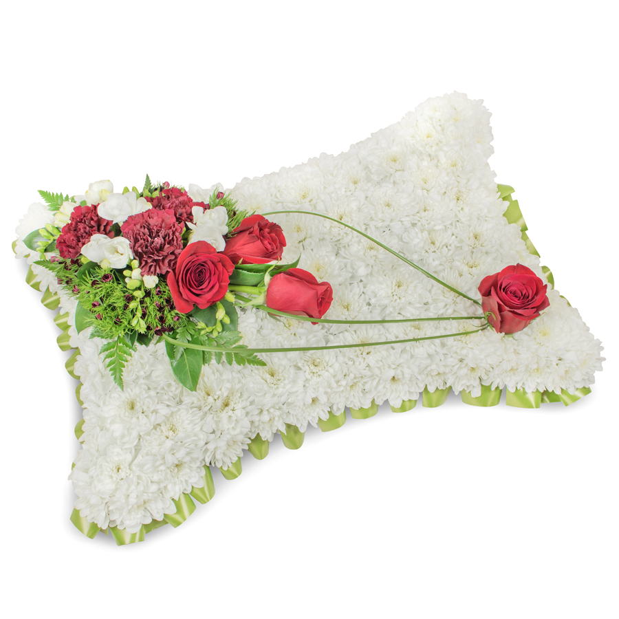 Show your support with our heartwarming sympathy bouquet, elegantly composed of white chrysanthemums, radiant red roses, sweet white freesias, deep dark red carnations, graceful dianthus, and soothing bear grass. This unique arrangement combines vibrant colors and delicate flowers to create a stunning tribute.